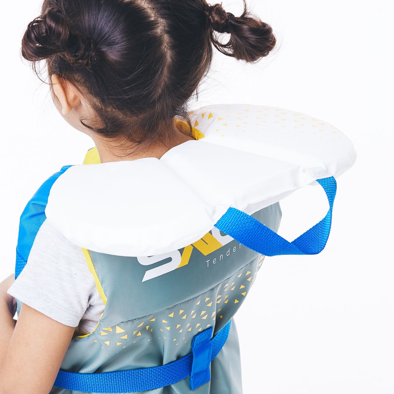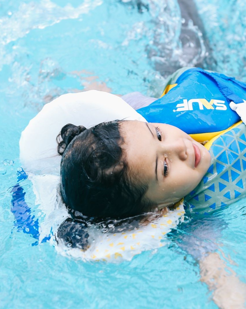 A large cushion to support kids’ heads when in the back float position. This patented feature brings a Sens-Twist™ movement; where the kids swim in the upright position, the collar folds down. When she’s turning into a back float, the collar spontaneously spread open, supporting the kid’s head and allowing her to float longer in comfort.