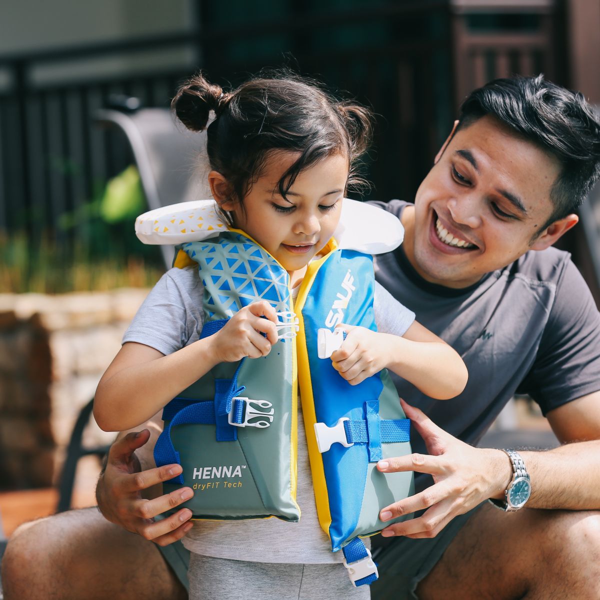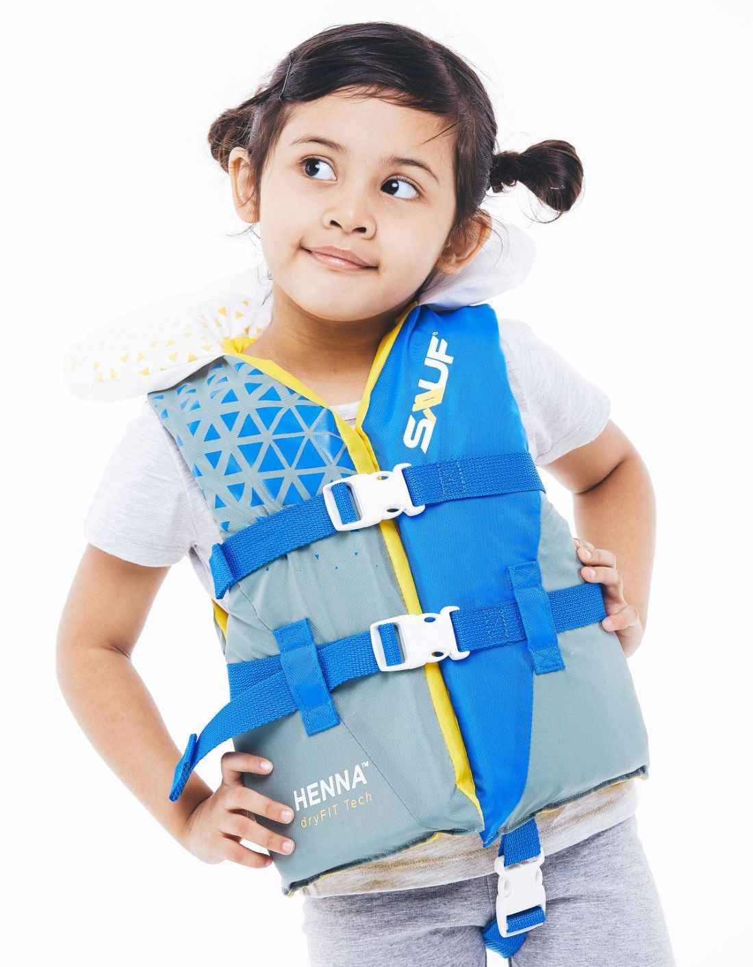 • SAUF brings to you the Hènna series kids life vest with DryFit Tech™ an ultralight, easy to dry, and body-shaped patented vest construction that caters to children’s needs in safety. This technology offering better mobility and flexibility to children. Comfortable for all-day-wearing.